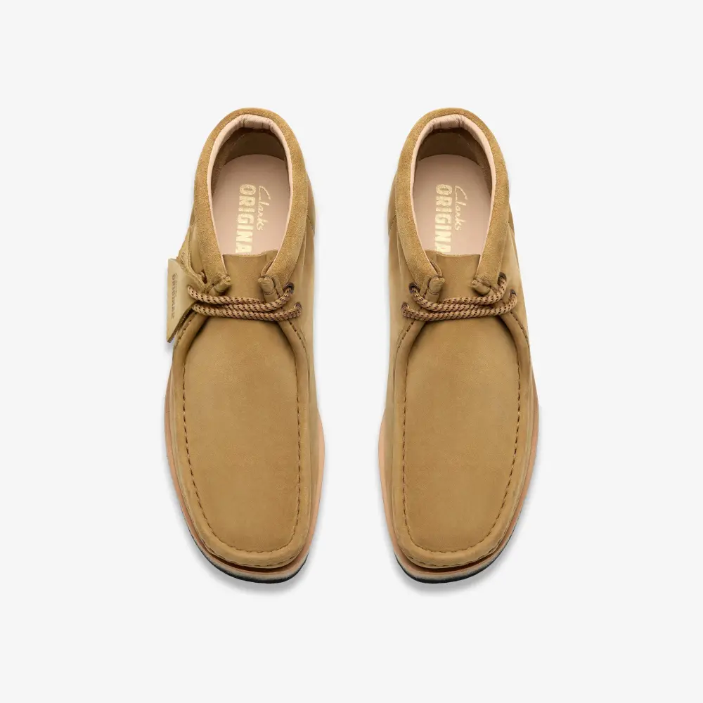 The shoe also features two distinctive FOBs—Clarks Originals and Wallabee™—and is completed with the Clarks Originals logo on the sock, showcasing its authentic heritage.