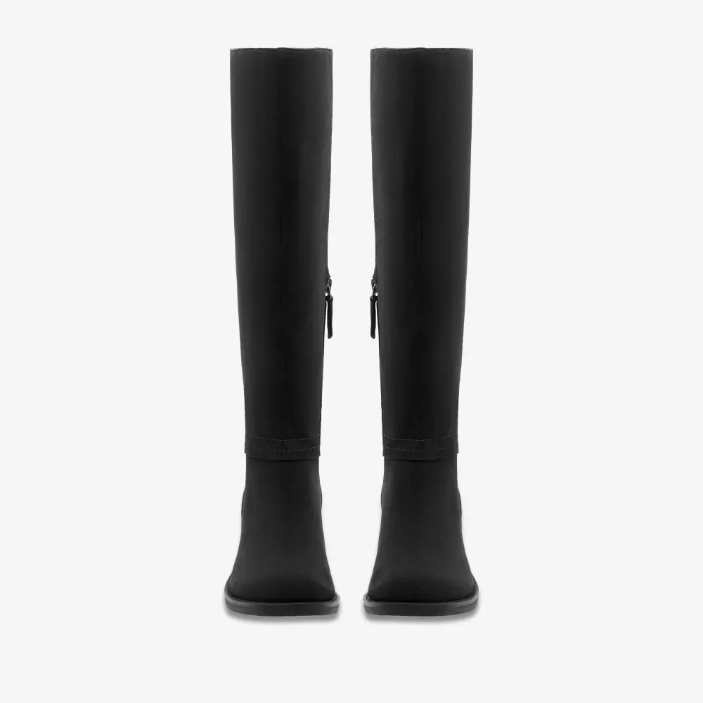 Elevate weekday or evening dressing with classic knee high boot Chamberly Hi. A luxe black leather upper and stacked heel deliver a premium, timeless finish, completed with a pillowy foam footbed for signature round-the-clock Clarks comfort.
